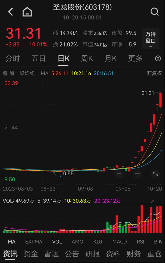 9月28日至10月20日,华为汽车概念公司圣龙股份连续11个交易日股价涨停,收盘价累计涨幅达185.68%。